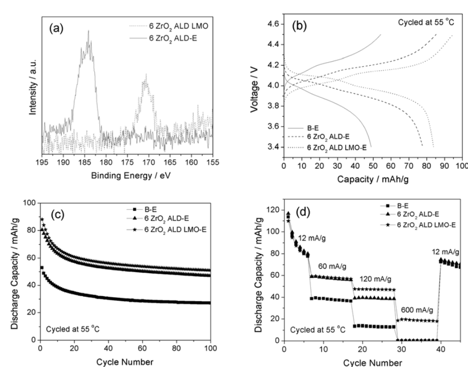 提高放电容量:ZrO2 包覆不仅提高了循环稳定性,还增加了放电容量。在 55°C 条件下,6 ZrO2 ALD LMO-E电极的放电容量显著高于裸电极(B-E)和6 ZrO2 ALD-E电极。