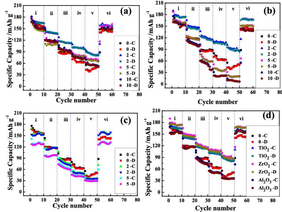 图 2.不同ALD循环(0、2、5、10和50)金属氧化物包覆LiCoO2电极的速率性能:(a) TiO2, (b) ZrO2和(c) Al2O3在不同电流密度下:(i) 100, (ii) 300, (iii) 500, (iv) 600, (v) 700和(vi) 100 mA g 1;(d)不同金属氧化物包覆的LiCoO2电极在 2 次ALD循环下的速率性能比较.