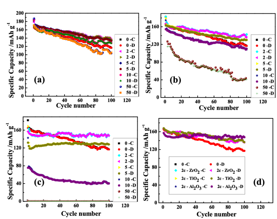 图1. 不同原子层沉积(ALD)循环次数(0、2、5、10 和 50 次)的金属氧化物包覆的 LiCoO2 电极的可逆充放电容量与循环次数的关系:(a)TiO2,(b)ZrO2,(c)Al2O3;(d)2 次 ALD 循环包覆不同金属氧化物的 LiCoO2 电极的循环性能比较