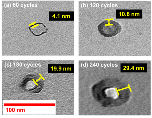 4.经过(a) 60次、(b) 120次、(c) 180次和(d) 240次ZrO原子层沉积(ALD)循环后的TiO/ZrO核壳纳米粒子的透射电子显微镜(TEM)图像。