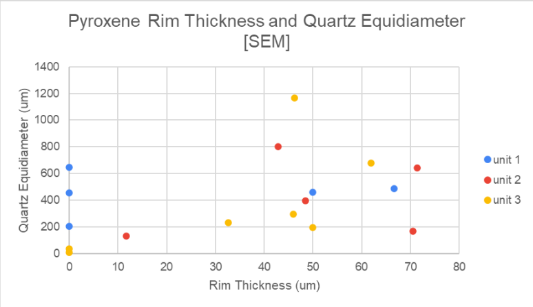 图表描述了石英晶体的等效直径(以微米计)与单斜辉石反应边厚度(以微米计)之间的关系。所展示的数据是通过扫描电子显微镜(SEM)成像技术收集的。