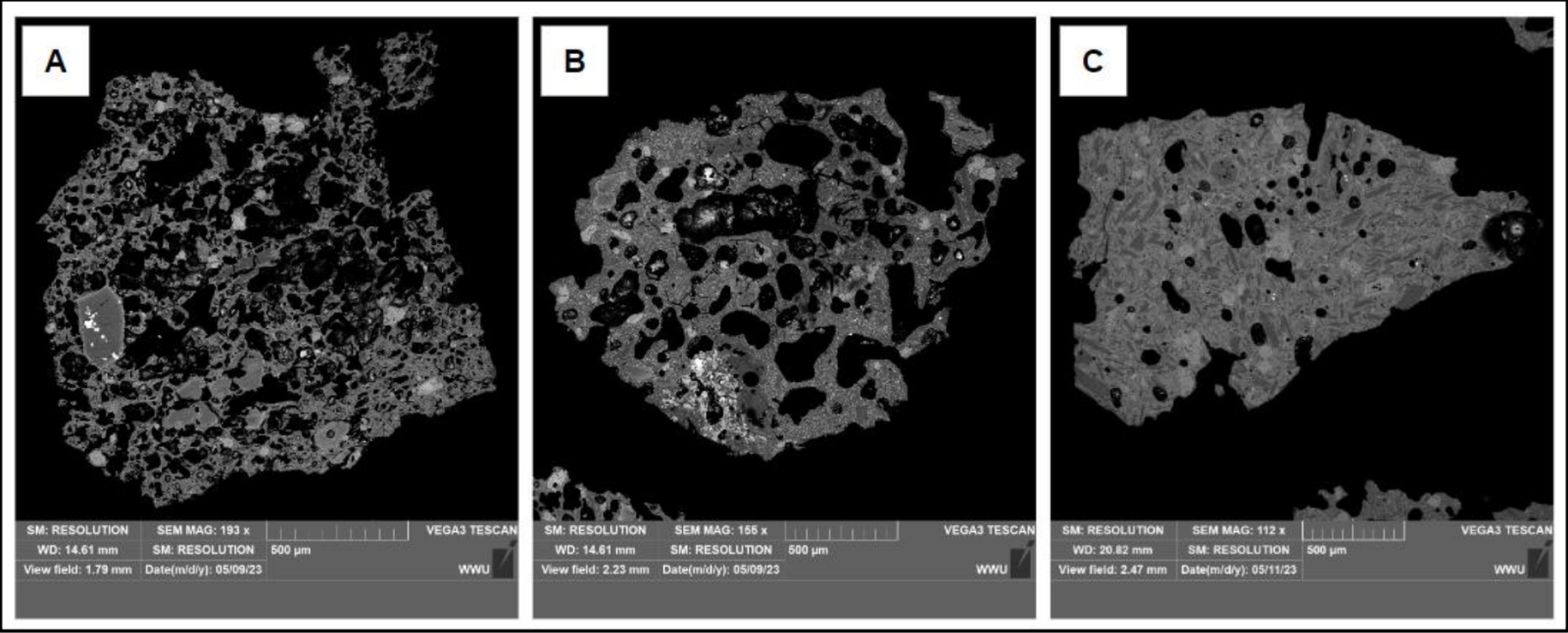 展示了来自 Cinder Cone 火山灰按孔隙度递增序的扫描电子显微镜(SEM)图像。最左边的图像是金色火山灰团块,中间的图像是黑色火山灰团块,而最右边的图像是致密火山灰团块。