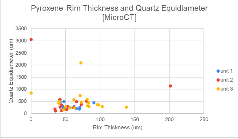 图表展示了石英晶体的等效直径(以微米为单位)与单斜辉石反应边厚度(以微米为单位)之间的关系。所呈现的数据是通过显微CT成像技术收集的。