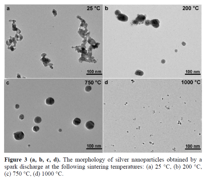 Lizunova【1】等人通过火花放电发生器合成银纳米颗粒,然后利用管式炉进行烧结。实验研究了烧结温度(25℃-1000℃)对银纳米颗粒形貌和粒径的影响,采用透射电子显微镜(TEM)和气溶胶光谱仪对颗粒进行表征。烧结温度对银纳米颗粒的形貌和粒径有显著影响。25℃-200℃时,颗粒以分形结构的聚集体为主;200℃ 以上时,形成单个球形纳米颗粒。在 200℃-900℃ 范围内,颗粒平均粒径约为 45nm 且保持相对稳定,而在 1000℃ 时,粒径显著减小至 7nm。利用管式炉可实时调控银颗粒的结构和尺寸,减少团聚,从而满足光学和医学等领域对银纳米颗粒性能的要求。