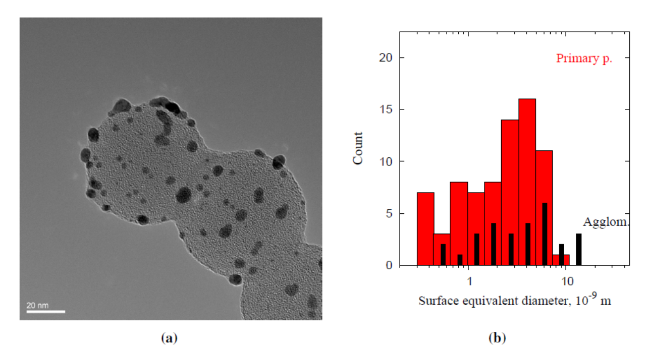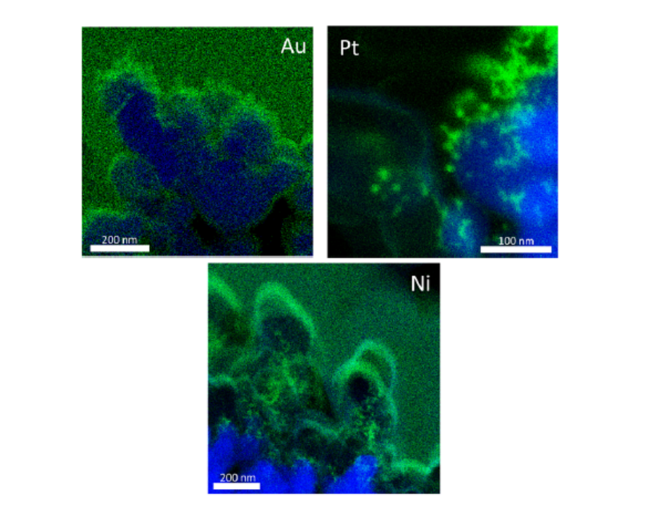 通过火花烧蚀法成功生成了 Au、Pt、Cu 和 Ni 四种金属的纳米颗粒,其尺寸分布在 1-5nm 范围内。Au 和 Pt 纳米颗粒在 TiO₂ 表面形成了高密度的“岛状”涂层,即单个金属纳米颗粒主要分布在TiO₂ 基底颗粒的边缘。通过增加沉积时间至数小时,Au 可以在 TiO₂ 表面形成连续的涂层。由于催化并不需要连续涂层,因此可在较短时间内即可获得出色催化剂覆盖的材料。