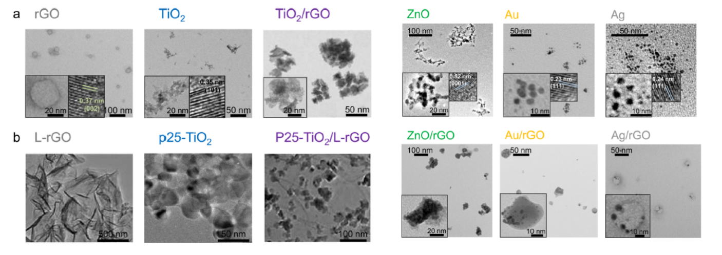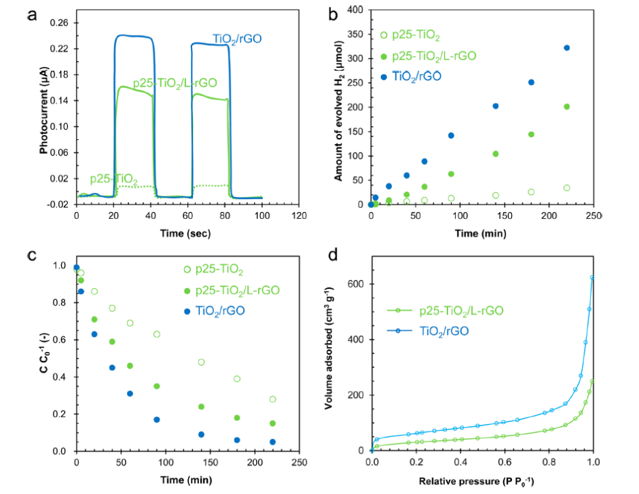 这种杂化结构在光催化产氢和降解染料方面表现出优异的性能。与商业化的 P25-TiO2 和大尺寸 rGO 杂化材料相比,气相自组装的 TiO2/rGO 纳米片具有更高的光催化活性。