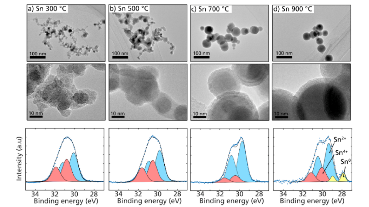不同飞行加热温度下产生的粒子的TEM图像(上、中行)和相应条件下记录的 Sn 4d 光电子能谱(下行)