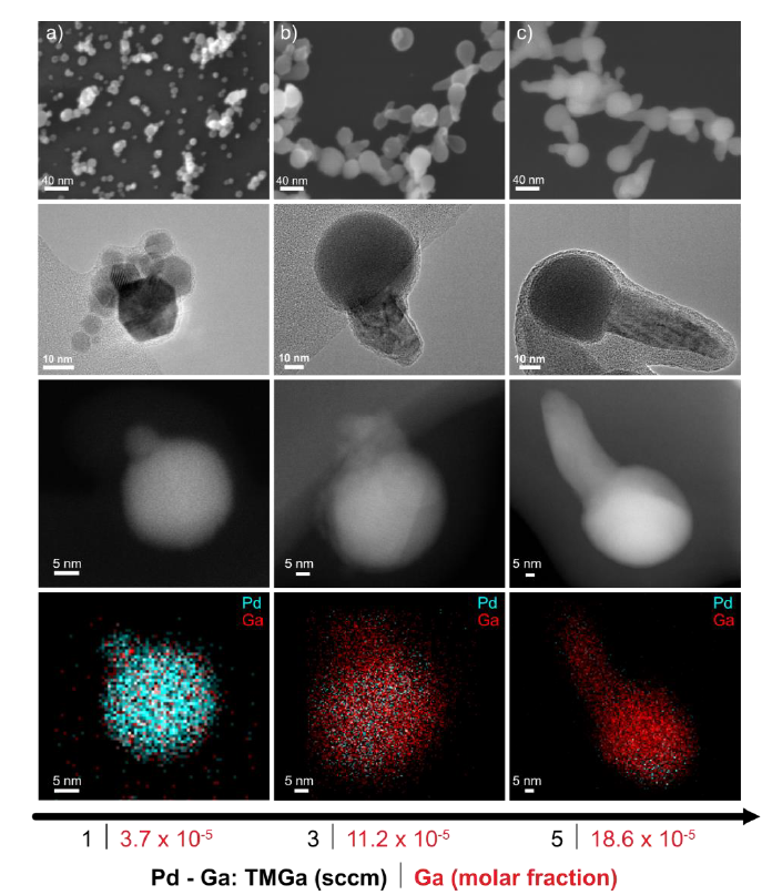 在 750℃ 和 900℃ 下,随着三甲基镓(TMGa)流量的增加,颗粒尺寸增大且聚集现象明显。900℃ 时,高 TMGa 流量导致颗粒形成链状结构,镓含量增加。烧结过程促进不同钯镓相的形成,如 Pd5Ga2、Pd2Ga 和 PdGa 等,且高温下相分离现象更明显,可形成富含镓的区域和特定的合金相,为制备具有特定催化性能的钯镓合金纳米颗粒提供了可能。