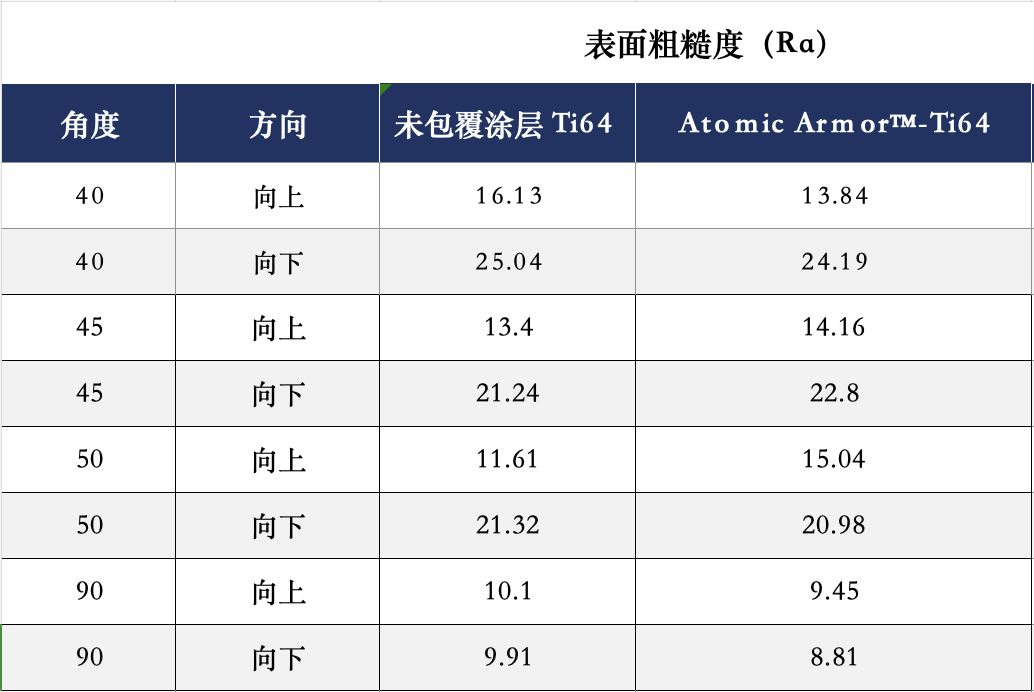 表1. 未包覆涂层和通过Atomic Armor™技术包覆涂层的Ti64制造的立方体样品在不同打印头方向下的表面粗糙度对比。