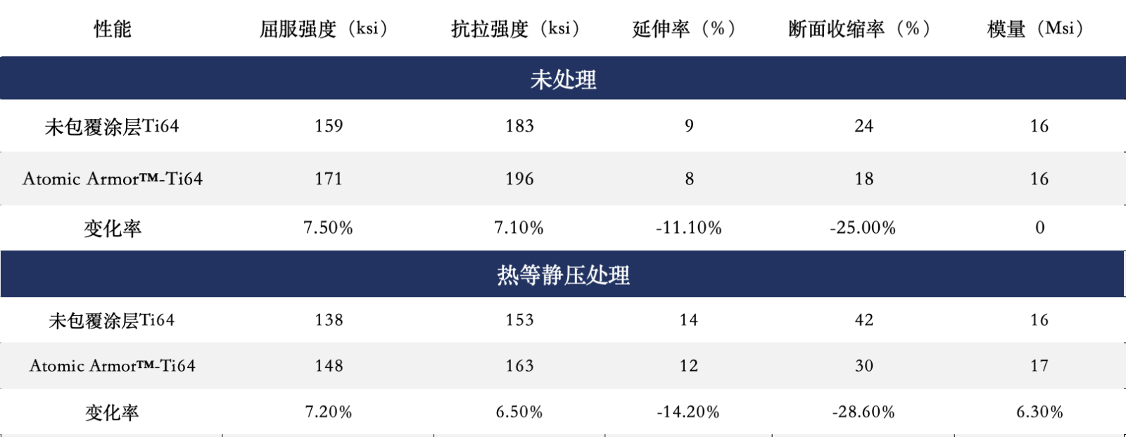 表2. 未包覆涂层与通过Atomic Armor™技术包覆涂层的拉伸试样的机械性能对比。拉伸试样分别进行了未经处理和热等静压(HIP)处理。