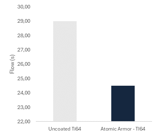 未包覆涂层的Ti64与通过 Atomic Armor™ 技术包覆涂层的Ti64的霍尔流动时间对比