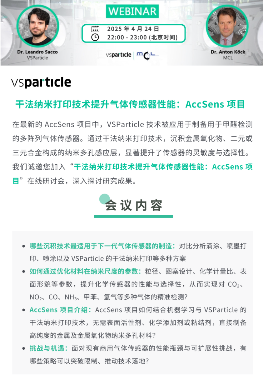 在科技飞速发展的今天,气体传感器的开发对于环境监测、工业安全以及健康医疗等领域具有至关重要的意义。近期,VSParticle与Materials Center Leoben Forschung GmbH(以下简称MCL)合作开展的 AccSens 项目,通过结合机器学习与纳米打印技术,为气体传感器的研发带来了突破性的进展。