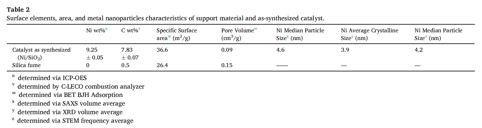 新鲜催化剂中 Ni 以面心立方 (fcc) 金属态存在,平均晶粒 3.9 nm,SAXS 中位粒径 4.6 nm,颗粒均匀分散。表面残碳 7.8 wt%,C/Ni摩尔比≈4:1,表明部分二茂配体已热解。BET 测得比表面积 36.6 m² g⁻¹,较裸硅灰(26.4 m² g⁻¹)提升约 39%,原因归结为碳层及纳米 Ni 颗粒的额外表面贡献。具体见上图图1。