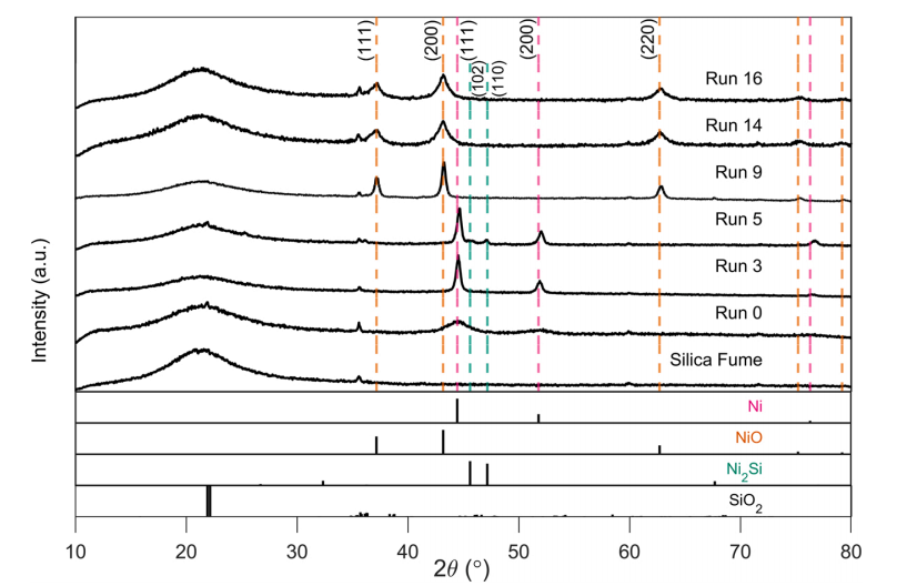 硅灰(载体)、合成态催化剂(Ni/SiO₂)以及经选定热处理后样品的 X 射线衍射图。各运行参数见表 3。垂直虚线标示各相最显著衍射峰并用颜色区分;所选低指数晶面的 Miller 指数标注在对应虚线旁。