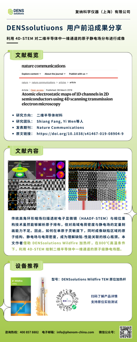 传统高角环形暗场扫描透射电子显微镜(HAADF-STEM)与相位重构技术虽然能够解析原子排布,但对局域电荷密度与静电场的定量刻画能力不足。因此,如何在单原子灵敏度下,同时成像缺陷区域的原子结构、静电场与电荷密度,成为理解缺陷-性能关联的核心瓶颈。本文作者借助 DENSsolutions Wildfire 加热杆,在800℃高温条件下,利用 4D-STEM 绘制二维半导体中一维通道的原子级静电场图。