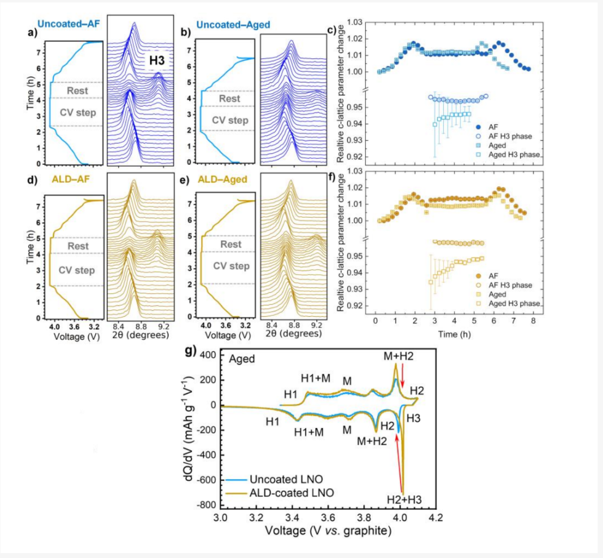 图4:未包覆LNO正极(a)化成后和(b)老化过程中的原位XRD数据及相应电压-时间曲线;(c)未包覆正极的c轴晶格参数相对变化。ALD包覆LNO的原位数据:(d)化成后、(e)老化后;(f)包覆LNO的c轴晶格参数相对变化。(g)老化后由原位测试得到的dQ/dV曲线;圆圈与三角形分别表示形成后及100循环后的H3相转变。H3相信噪比不佳导致图(c)中误差较大。