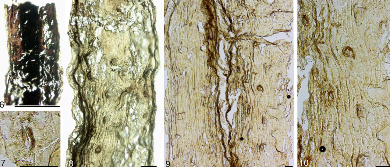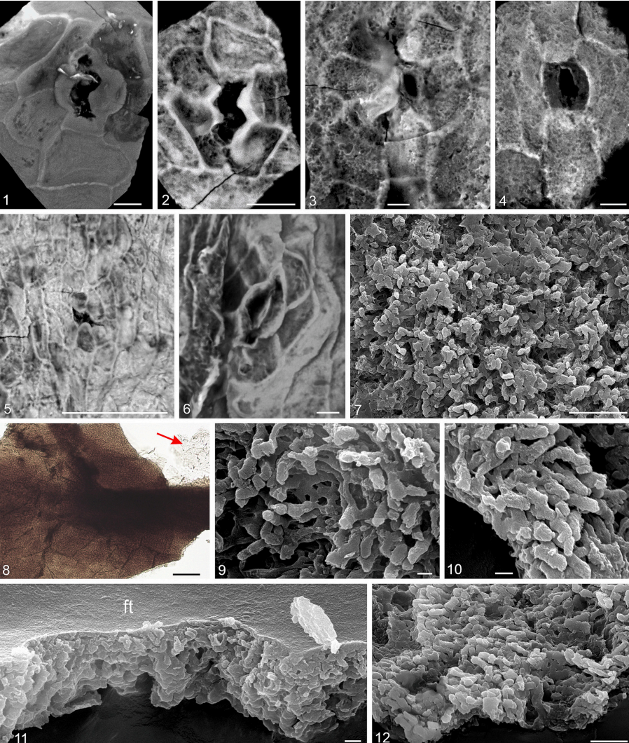产自俄罗斯北极新西伯利亚群岛科特利内岛阿普特–阿尔比阶Balyktakh组。图1–6为杯瓣表皮气孔的激光共聚焦显微图;图7、9–12为扫描电镜图,图8为光学显微图。