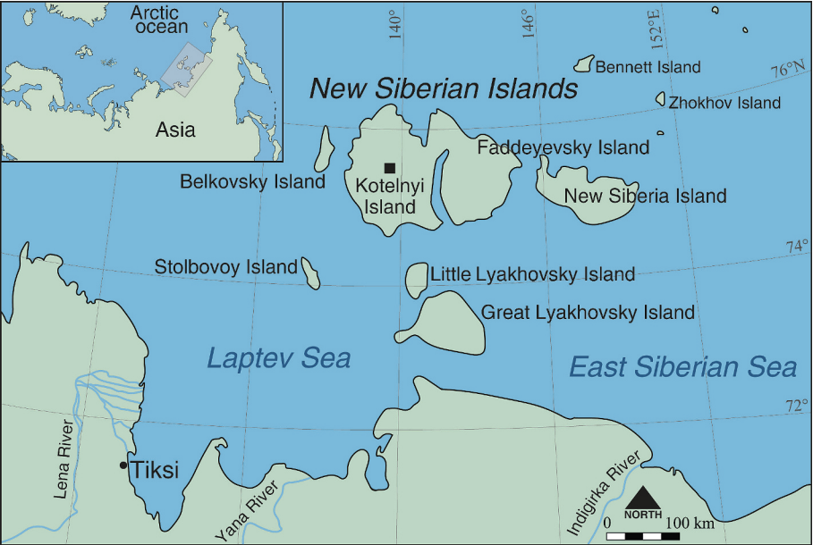显示俄罗斯新西伯利亚群岛科捷利内岛巴雷克塔赫河(Balyktakh River)化石产地位置的地图。
