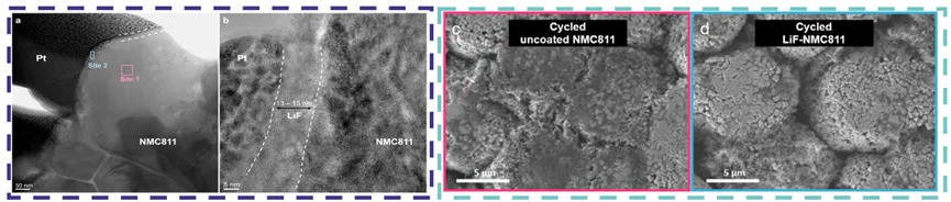 左:经过 150 圈 ALD 包覆 LiF 后 NMC811 的横截面TEM图像以及 HR-TEM图像;在 1C 下循环500 次后从全电池中取出的未涂层 NMC811 和涂层 LiF-NMC811 电极的 SEM 图像[3]