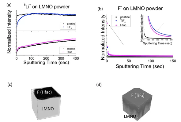 两种氟源行为完全不同:Hfac 促进了 Li 向颗粒内部的扩散,形成富锂的 LMNO 结构,而 TiF₄ 可导致F扩散进入晶格,部分掺杂。