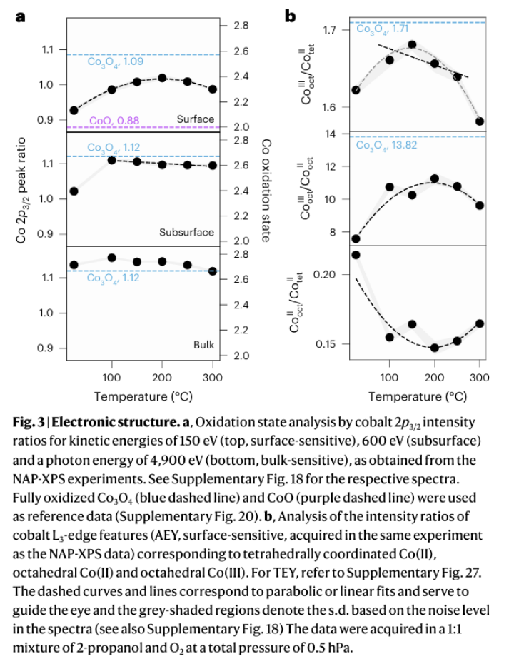 原位 XPS 和 NEXAFS 数据明确显示,在反应工况下,催化剂表面和次表面的 Co 氧化态并没有随温度单调变化,而是呈现出一种抛物线式的演变。在某个特定温度区间(结合前文可知在 200°C 附近),表面 Co 的平均氧化态达到了最高值(抛物线的顶点),随后在更高温度下再次下降。这暗示了在此温度节点,催化剂表面发生了某种剧烈的重构。