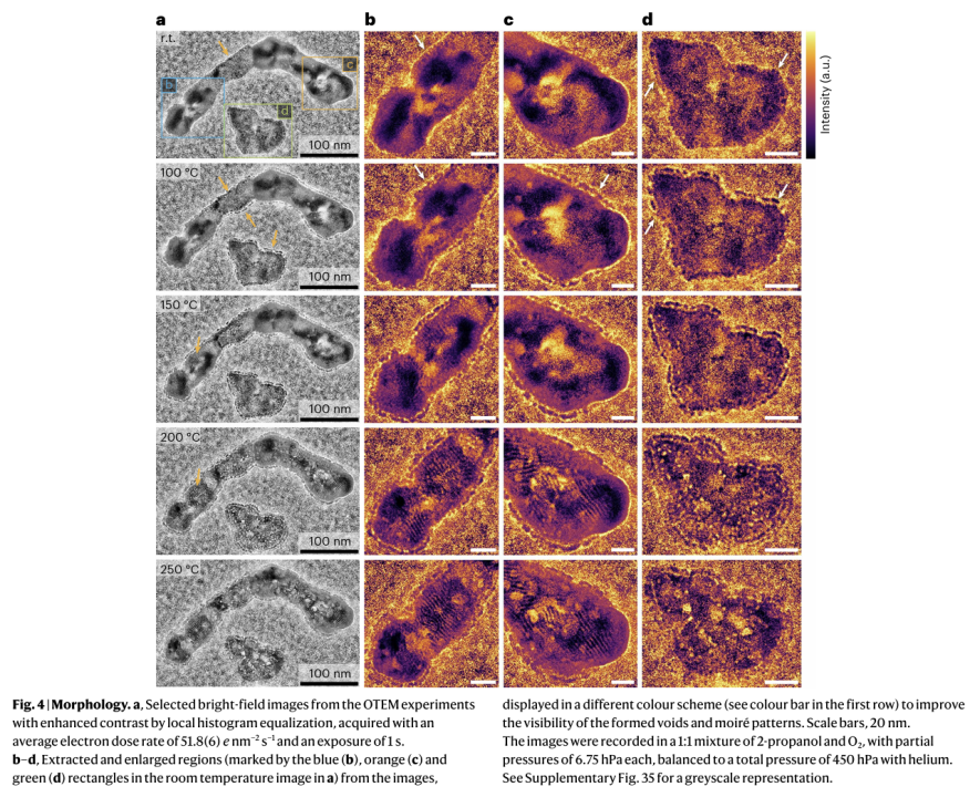 通过DENSsolutions 气相加热原位样品杆,作者在真实的反应气氛和压力下实时观察到了令人震惊的形貌变化。图像直观地展示了随着温度升高,尖晶石颗粒边缘不仅发生重构,其内部更是形成了明显的纳米级孔洞 (voids)。这些孔洞的形成是由于体相离子向表面扩散(柯肯达尔效应类过程)导致的,直接证明了催化剂在反应中处于高度动态的物质输运网络中,而非静态的刚体。