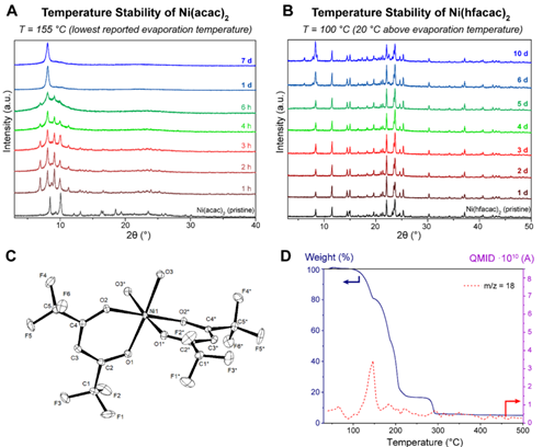 (A)原始 Ni(acac)2 和在 155°C 下加热规定时间后回收的 Ni(acac)2 的 PXRD 图比较。(B)原始 Ni(hfacac)2 和在 100°C 下加热规定时间的 Ni(hfacac)2 的 PXRD 图比较。(C)Ni(hfacac)2 的 X 射线结构。(D)在 Ar 下以 5°C·min-1 的加热速率收集的 Ni(hfacac)2 的 TGA-MS 数据。