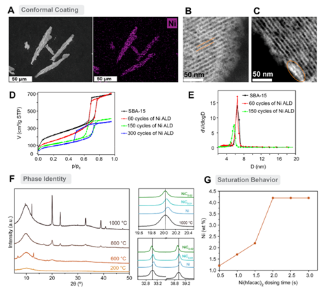 经过 60 和 150 个 ALD 循环后,Ni 元素在 SBA-15 颗粒整体均匀分布。Ni 纳米颗粒沿 SBA-15 孔壁均匀分布,介孔结构完好。150 循环后,介孔孔径分布保持不变,但微孔吸附显著减少,表明 Ni 选择性沉积在微孔中。证明了该工艺能实现高度保形的涂层,适用于复杂纳米结构,并强调了其无溶剂、可扩展、高重现性的合成优势。