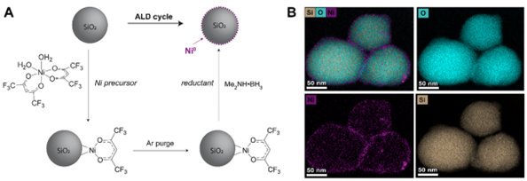 (A)在二氧化硅纳米粒子上,Ni(hfacac)2 和 Me2NH·BH3 与热镍原子层沉积 AB 型循环的反应序列。(B)在 200°C 下进行 60 次 ALD 循环的二氧化硅纳米颗粒的 Si、O 和 Ni 的 EDX 图谱