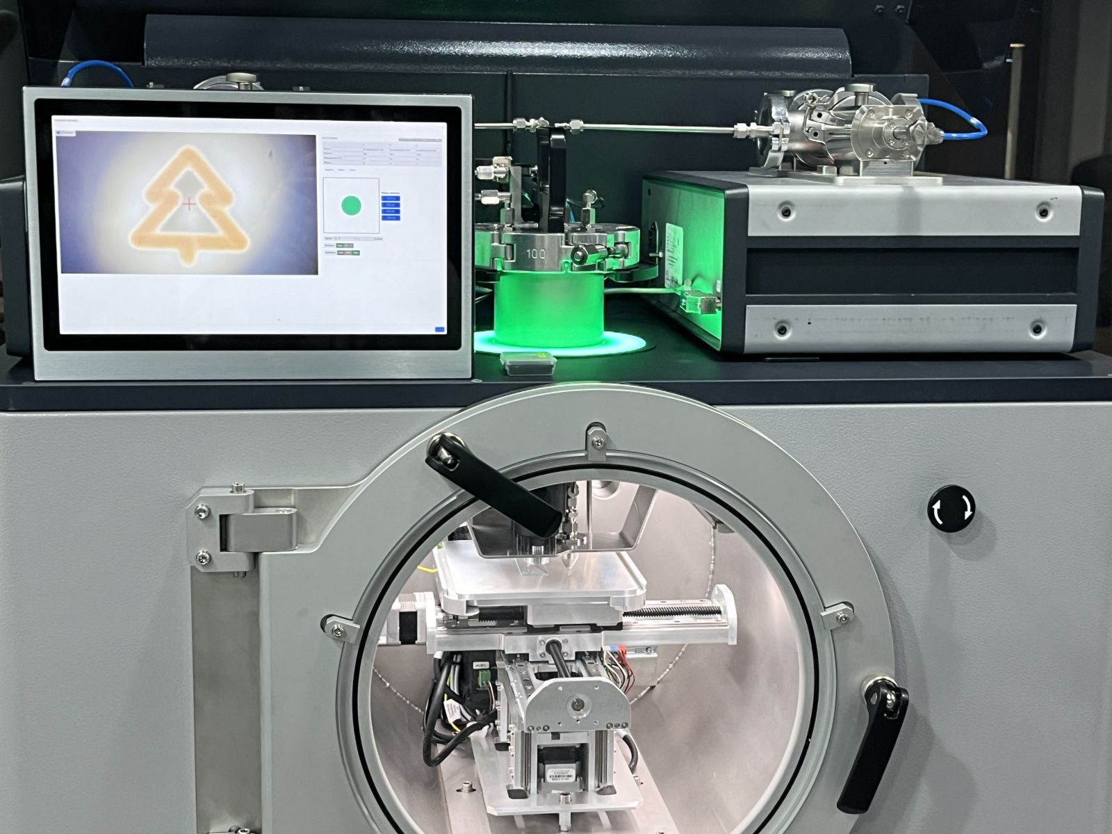 使用 VSParticle-P1 纳米印刷沉积系统,可以通过运行编辑好的脚本来确定所需的打印图案,实现在任意基底的图案化打印, Asif 现场为我们演示了如何使用该设备将金纳米颗粒绘制为圣诞树图案!