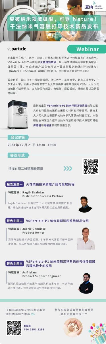 本次研讨会我们有幸邀请到 VSParticle 公司的产品经理 Joerie Gennisse 与应用工程师 Asif Islam现场为我们揭幕新品,深度介绍干法纳米气溶胶打印技术原理及其在传感器和电催化领域的应用分享。(详情见 新品发布,“印”领未来 | 复纳科技携纳米气溶胶打印系统强势来袭,发布会报名开启!