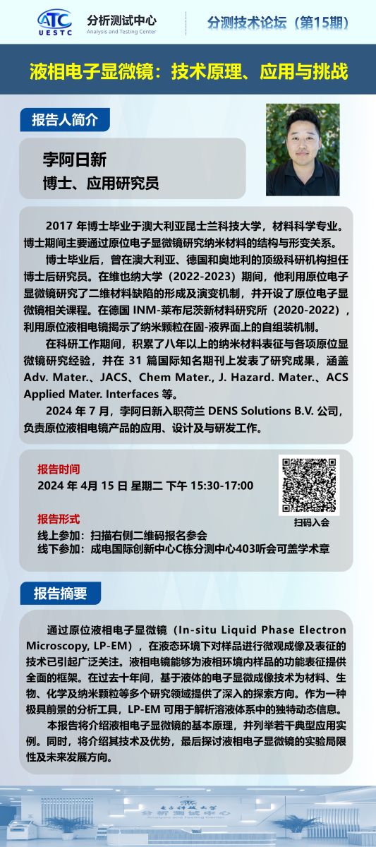 电子科技大学分析测试中心将于 4 月 15 日 15:30-17:00 举办“液相电子显微镜:技术原理、应用与挑战”技术论坛(第 15 期)。本次论坛将由孛阿日新博士主讲,他是一位在液相电子显微镜领域有着丰富研究经验的应用研究员。