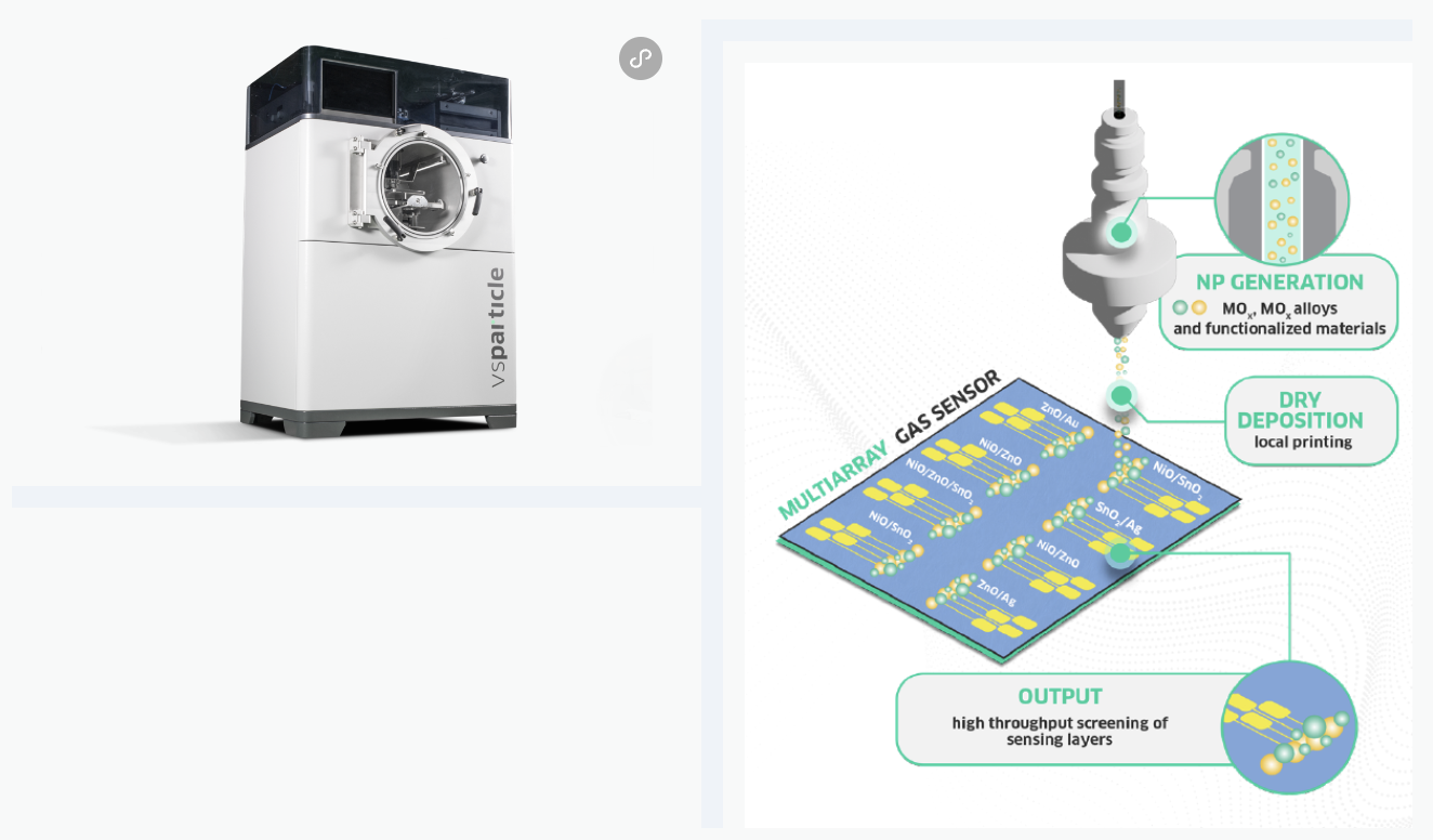 VSParticle 独特的干法纳米打印技术,沉积金属氧化物、二元或三元合金构成的纳米多孔感应层,显著提升了传感器的灵敏度与选择性。VSP 与 MCL 合作开展的Accsens 项目,被应用于制备用于甲醛检测的多阵列气体传感器。
