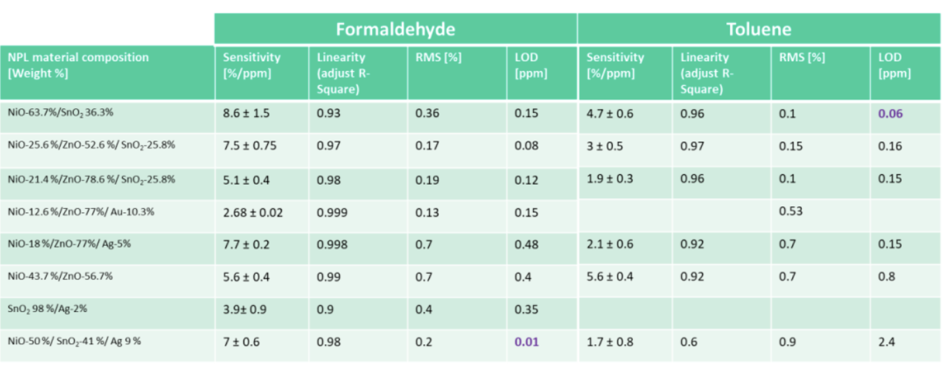在本案例中,基于金属氧化物半导体(MOS)及金属催化剂的纳米多孔层(NPLs)通过印刷方式沉积在多传感器阵列平台上,并以甲苯和甲醛作为目标气体进行测试。最多三种不同组分的 NPLs 被用作传感层。研究从灵敏度、选择性、响应/恢复时间及检出限(LOD)等关键性能指标出发,系统分析了材料组成对气体传感性能的影响。