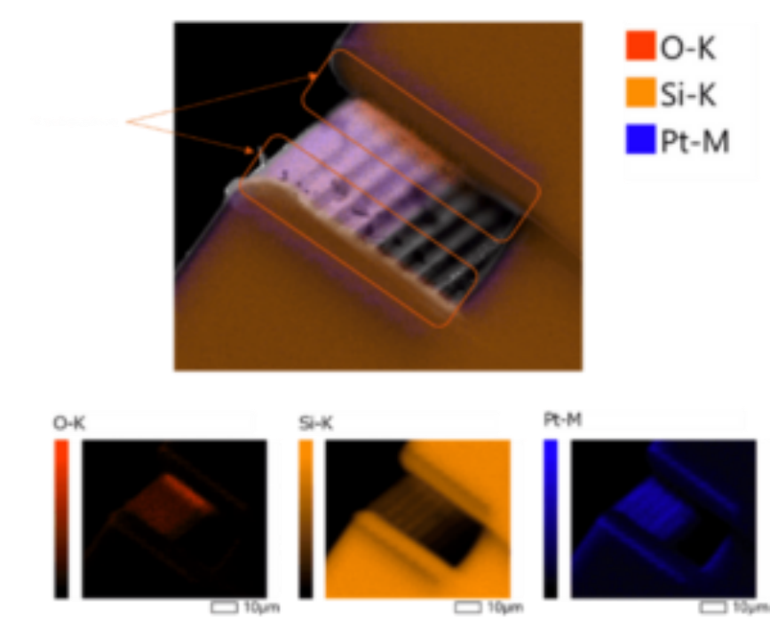 20 µm通道电容式传感器铂沉积的横截面图。EDX元素扫描结果表明,铂沿侧壁呈保形沉积