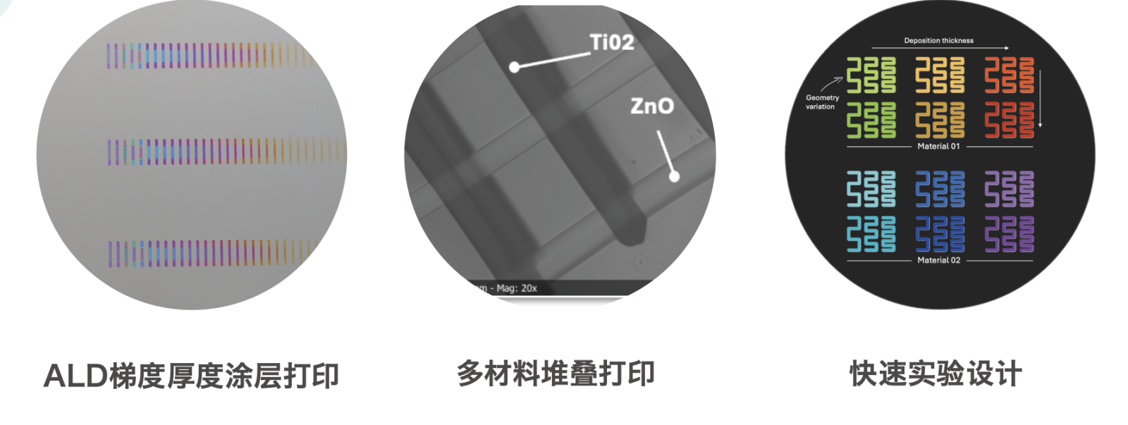 基于专利微喷嘴系统的原子级加工平台,可实现选择性沉积、蚀刻、掺杂与表面改性,并以软件方式实现高精度实时控制。与传统 ALD “全表面沉积 + 光刻 + 蚀刻”的流程不同,DALP® 让材料只在需要的位置沉积,真正实现“按需制造”。其能力正在加速半导体、MEMS、光子学、量子计算和航天制造等领域的创新。