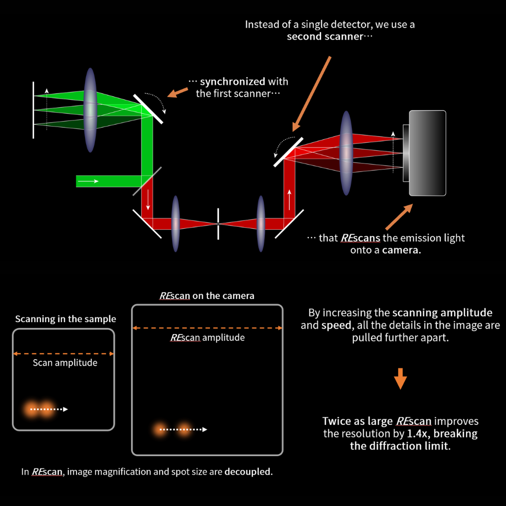REscan 技术由 Giulia M.R. De Luca 等人在 2013 年首次提出,通过增加一套光学扫描单元,在保留共聚焦显微镜良好光切片能力的同时,突破传统共聚焦在分辨率和信噪比上的取舍限制。