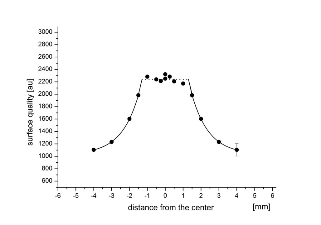 样品制备是使用 Technoorg Linda 的 SEMPrep-2 离子研磨仪 (SC-2000) 完成的。Technoorg Linda [2] 开发的 SC-2000 设备专为 SEM 样品制备而设计。它使用接近于与样品平行的 Ar+ 离子束,能够进行表面抛光和截面切削的样品制备(斜面切割)。该设备有两把离子枪; 能量范围为 2-16 keV 的高能离子枪和能量范围为 0.1-2 keV 的低能离子枪。样品台可以倾斜0-30°,表面抛光样品台可以做摆动或全面内旋转,以达到均匀的表面处理。在两种离子枪的配置下,接近平行的 Ar+ 离子束处理的面积约为 100 平方毫米,但均匀的中心部分约为 15 平方毫米,如图 1 所示。在离子切削过程中,样品位于真空室中保持 ~10 - 3 Pa 的动态压力。