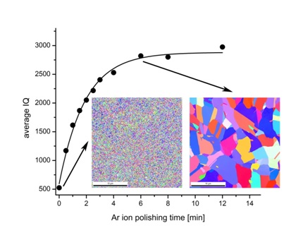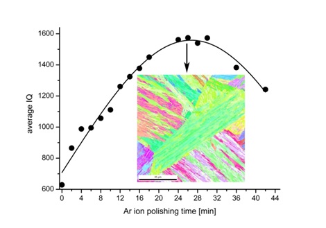 切削时间更多地取决于所处理样品的材料而不是切削角度。因此,当有一种新材料时,首先我们总是需要找到最佳处理时间,而这个过程需要额外的样品。 此初步操作是通过逐步增加时间并测量同一样本的图像质量 (IQ) 参数来完成的,如图 3 所示。最好选择此时的最佳时间,图像质量首先达到饱和水平的地方。从图 3 中可以看出,在铜的情况下,最佳参数为 7° 和 6 分钟。对于极硬的材料,例如马氏体钢,最佳时间可以在 7° 角时长达 26 分钟,如图 4 [4] 所示。同时该图表明Ar+离子过度处理并不是一个好的选择。