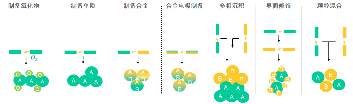 该方法只需操作两个参数,一键即可合成超过60种元素的单质,氧化物,多元合金,碳材料等纳米粒子。纳米粒子分散在流动的惰性气体氛围中,可实时沉积在多种基底上。同时,粒子以较好的分散态沉积,避免了严重的团聚。