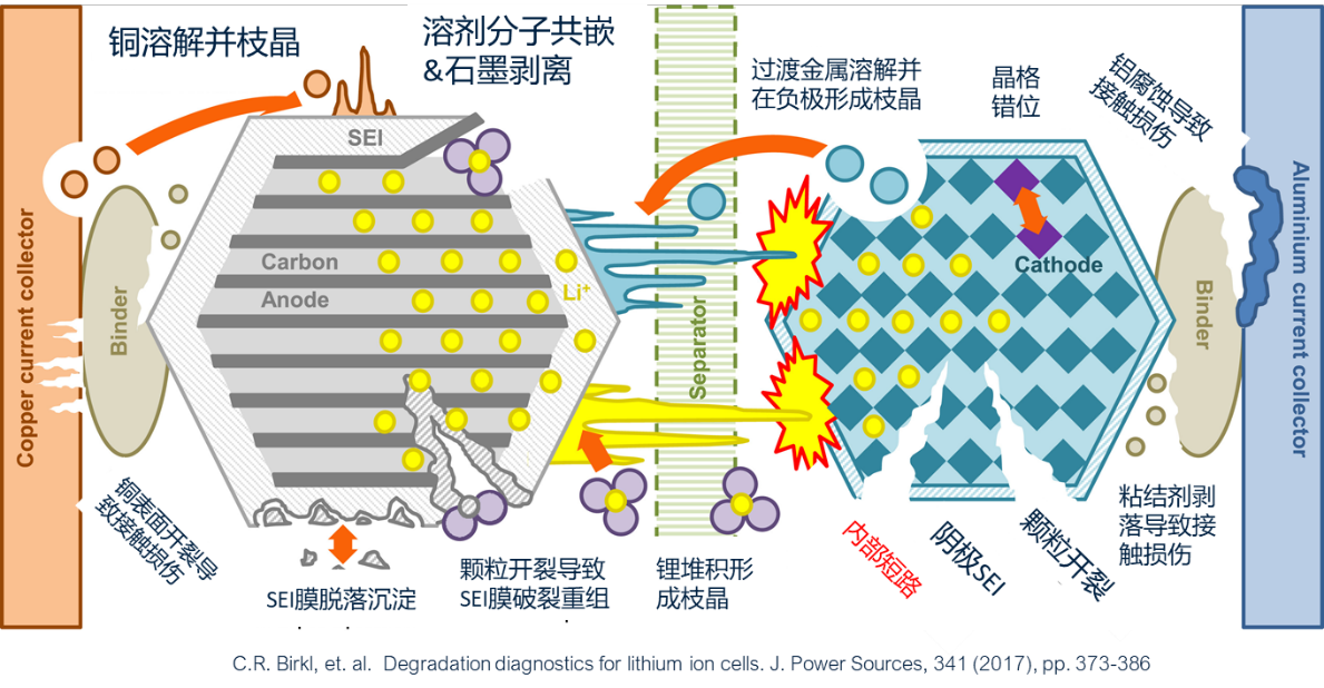 电池性能下降与电池内部的有害副反应及材料物理性能息息相关