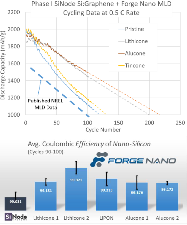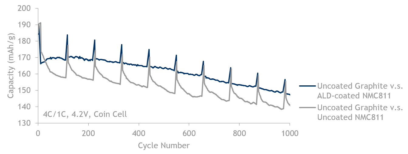 较高的充电电压往往会引起更多的副反应,削弱电极的稳定性。Forge Nano 的 ALD 工艺可以防止过度金属迁移,从而防止活性材料溶解和电池容量损失,在电池循环时保持低电阻。此外,ALD涂层还通过降低电池放电和充电过程中锂嵌入/脱嵌的能量势垒,从而提高锂离子导电性。降低电池电阻的反过来会促使电池寿拥有更高的容量保持率。