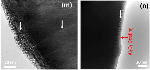纳米级的包覆涂层可以有效维持电极材料的稳定性,在橡树岭国家实验室团队与Forge Nano的一项研究中,使用中试级流化床系统Al2O3包覆后,三元正极材料在循环后可保持更稳定的结构,同时减少其相变以及相应的裂纹扩展。