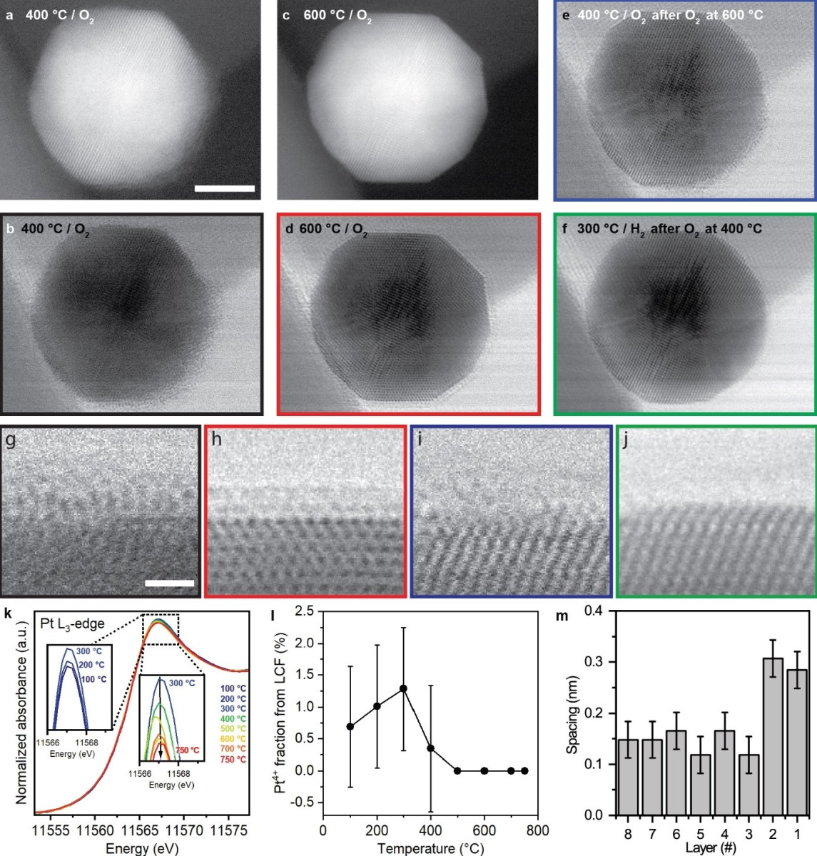 图1 | 在 200 mbar 氧气条件下形成的覆盖层: 分别在不同温度和气氛下的 Pt 纳米颗粒表征结果。
