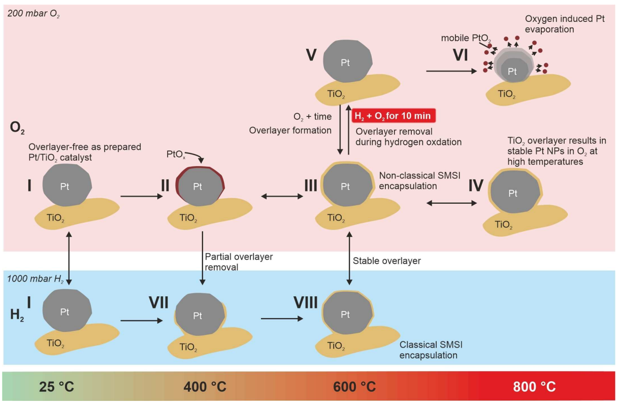 由二氧化钛支撑的铂纳米颗粒(NPs)表现出金属-载体强相互作用(SMSI),这可以诱导覆盖层的形成,以及该薄层支撑材料对纳米颗粒的封装。这种包覆改变了催化剂的性质,例如增加了它的化学选择性并稳定了它的烧结性能。包覆通常是在高温还原活化过程中诱导的,可以通过氧化处理逆转。然而,最近的研究结果表明,包覆层在氧气中是可以稳定的。