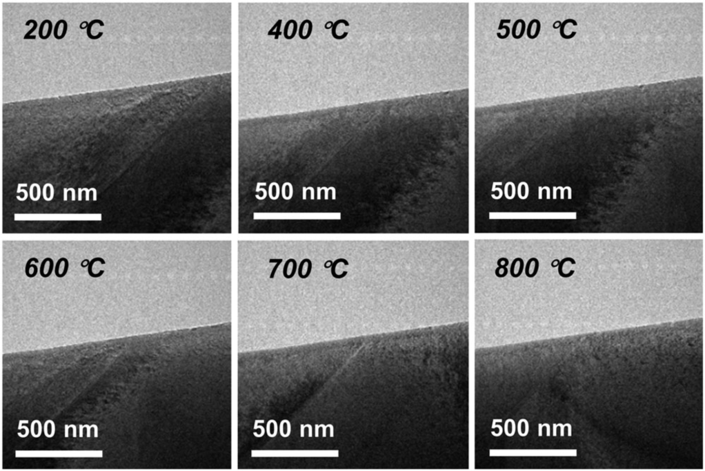 图 2: 在分压为 0.8 的氢气/水蒸汽混合气中,不同温度下的 CGO 原位 TEM 照片。