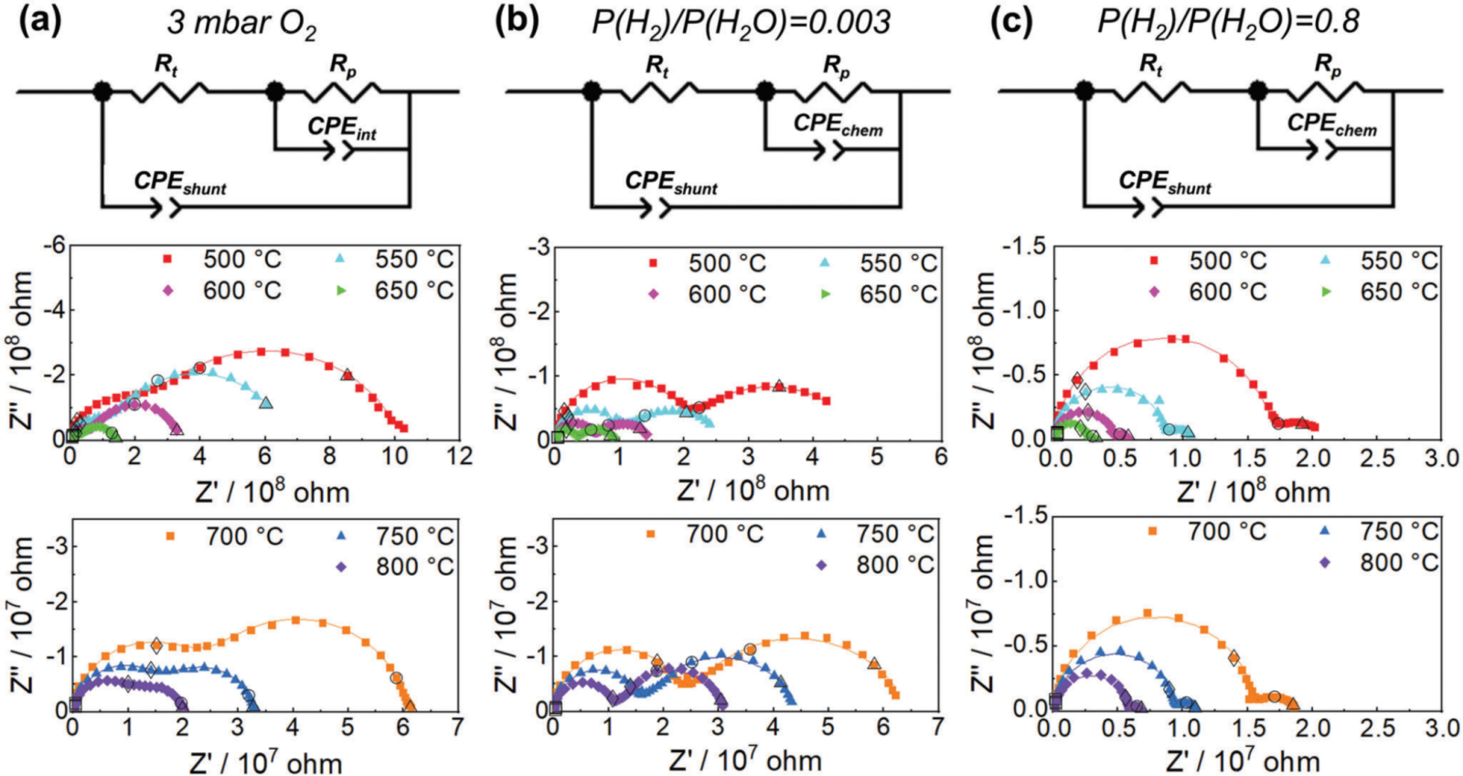图3:不同气氛下的阻抗谱与拟合线:(a) 3 mbar 氧气;(b) 5 mbar、分压为 0.003 的氢气/水蒸汽混合气;(c) 3 mbar、分压为 0.8 的氢气/水蒸汽混合气。其中,10 kHz(正方形)、100 Hz(菱形)、1 Hz(圆形)、0.1 Hz(三角形)的数据也分别以空心符号标记在谱图中。对应的回路模型分别展示在对应谱图的上方。