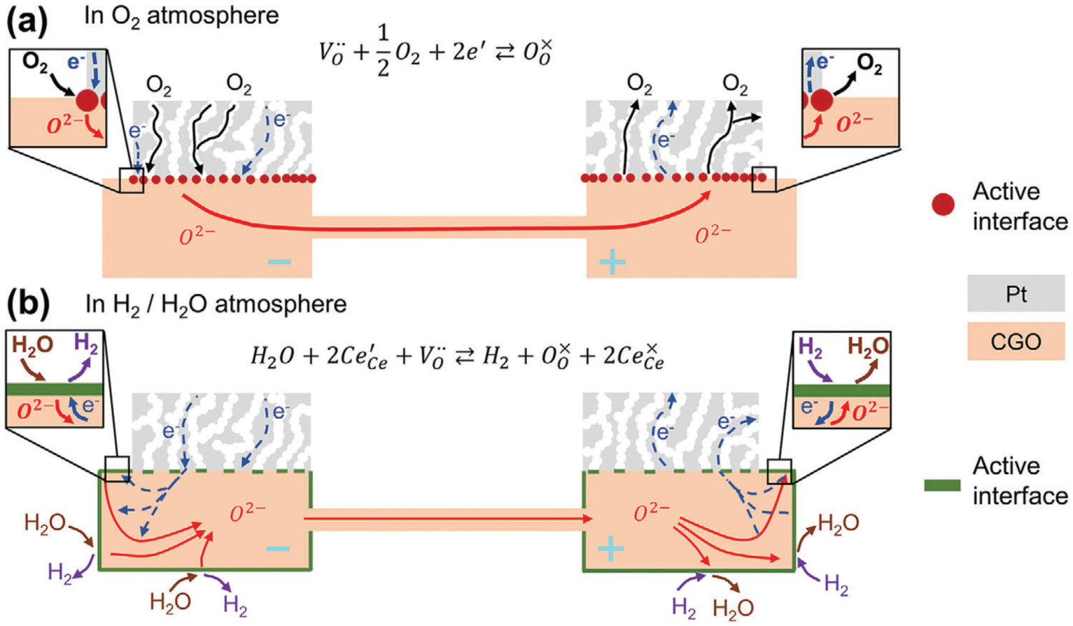 实验发现,无论是电导率还是 CGO 的表面交换反应都会受到气体氛围的影响。下图(图 4)中展示了不同气氛情况下的详细反应进程。两种进程明显不同:在氧气氛围下,CGO 是纯离子导体,活性区域仅限于 CGO 和铂电极的交界处;在氢气/水蒸气氛围下,电子可以通过 CGO lamella 的两侧传输,因此整个 CGO 表面都是活性区。