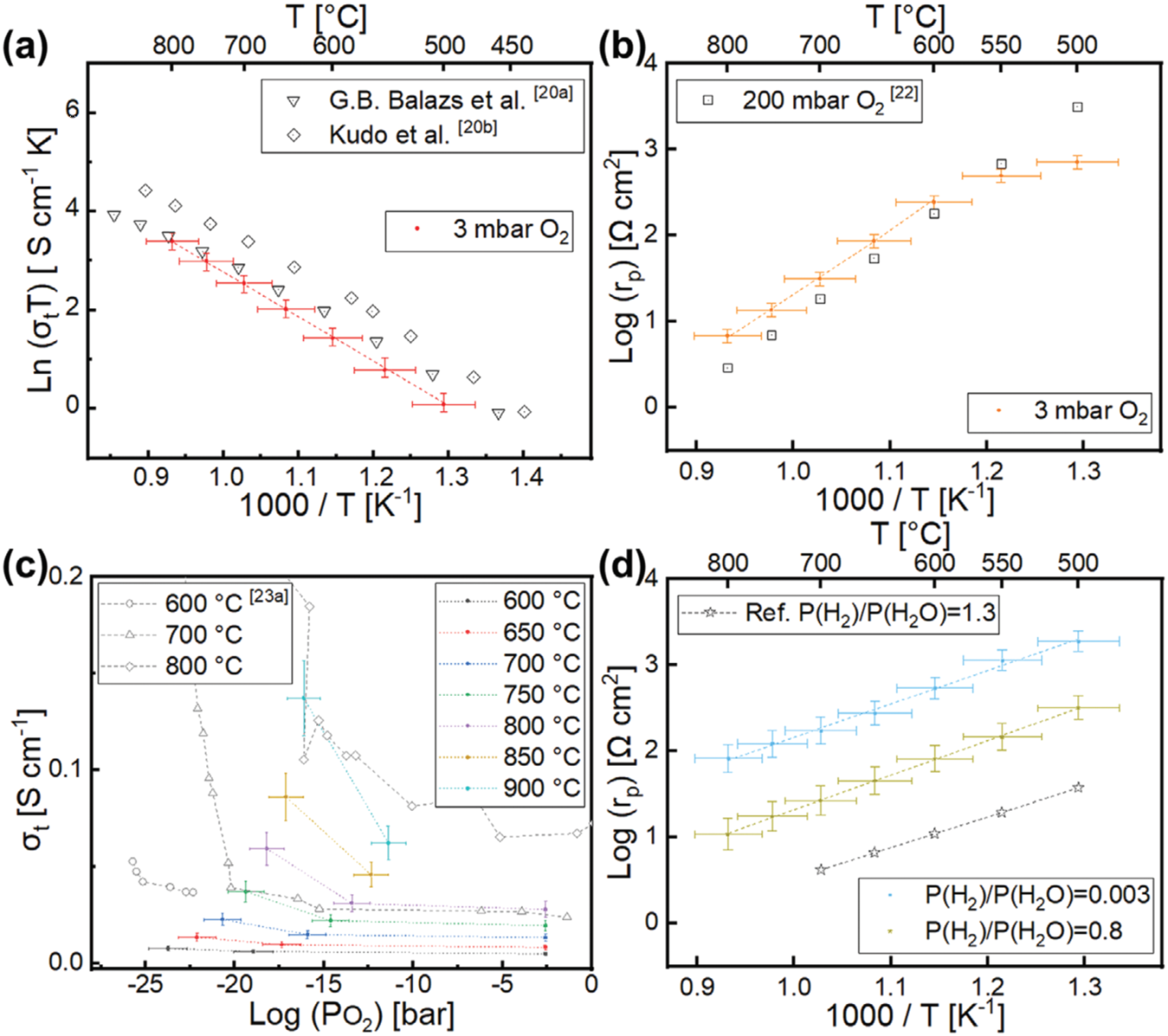 图 5:CGO 在不同气氛和温度下的电化学阻抗谱测试。(a) 3 mbar 氧气中的电导率与温度关系以及空气中(黑色)块体多晶 CGO 的参考文献数据;(b) 3 mbar 氧气中表面反应电阻与温度关系以及空气中(黑色)薄膜电极 CGO 的参考文献数据;(c) 总电导率与氧气压强的关系(彩色),空心黑色符号对应的是多晶 CGO 的参考文献数据;(d) 氢气/水蒸气氛围下表面反应电阻与温度的依赖关系(蓝、绿),氢气/水蒸气 1.3 分压下 CGO 薄膜电极的参考文献结果。
