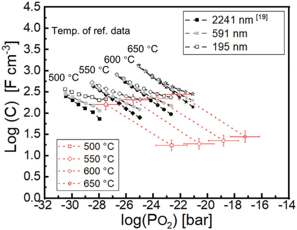 图6: 分别在 500 ºC、550 ºC、600 ºC 和 650 ºC 下,2000 nm CGO 侧边部分体积比电容与氧分压的函数,以及 2241 nm (黑色)、591 nm (灰色)、195 nm (黑色空心) CGO 薄膜的参考文献数据。